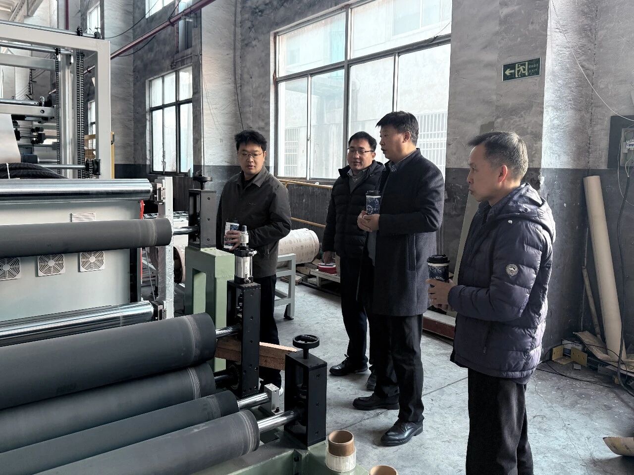 当天下午,秘书长一行继续走访,前往扬中市东昀磨具有限公司,董事长钱太兵热情接待并全程陪同。作为一家集砂布制造与转换业务协同发展的综合性企业,东昀磨具目前聚焦钢纸砂盘、拉绒片及各类异型产品研发生产,其中钢纸砂盘以出口为主,重磅纸基产品与拉绒片则深耕国内市场。在钱太兵董事长的带领下,调研团队先后参观了企业现有生产线及建设中的新厂区,详细了解生产工艺、产能布局与未来发展规划,直观感受企业的发展活力与布局远见。