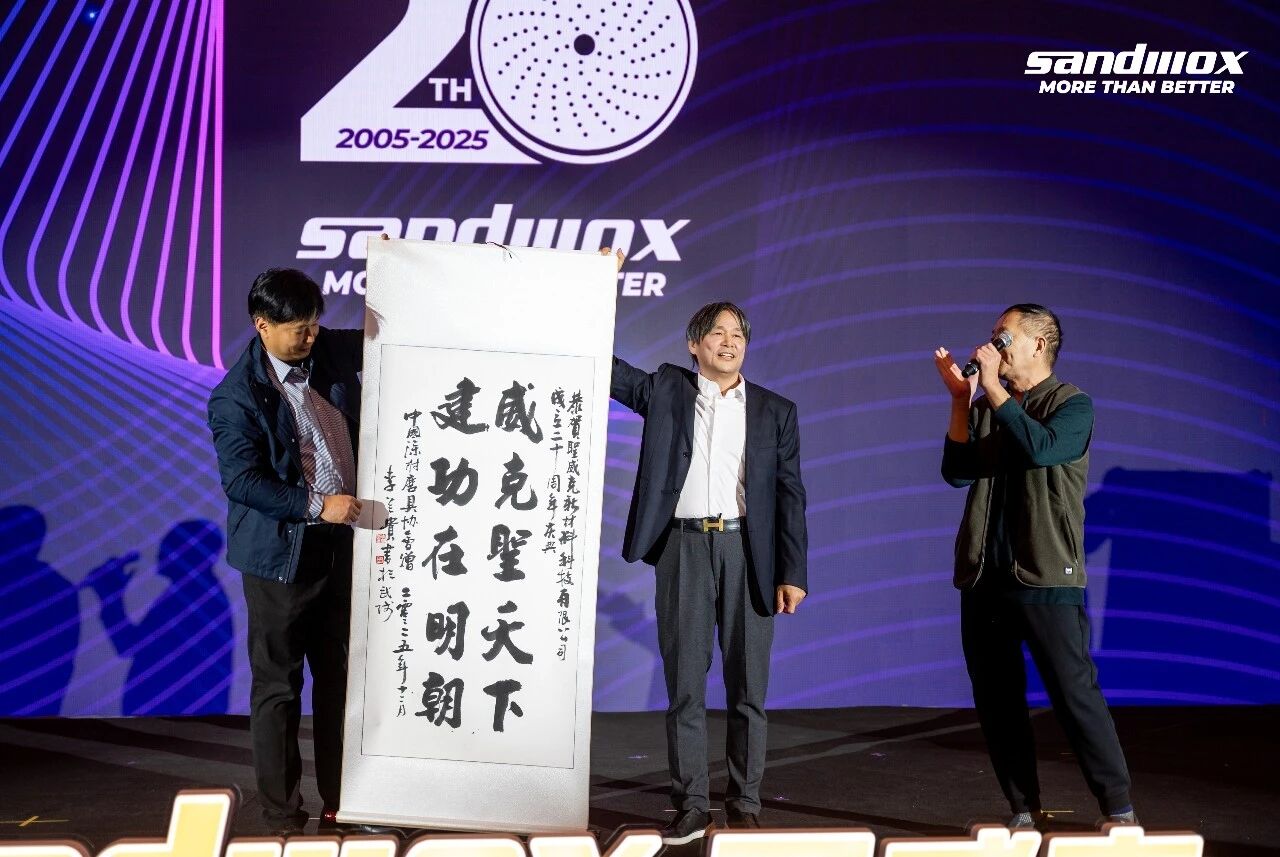 12月7日下午,分会秘书长一行与原高级顾问王明远共同抵达圣威克(常州)新材料科技有限公司,恰逢企业二十周年庆典隆重举办。活动现场,雷天利秘书长代表中国机床工具工业协会涂附磨具分会登台致辞,向圣威克二十年深耕行业的坚守与成就致以诚挚祝贺,并代表分会送上纪念礼物。他在致辞中提到,二十载栉风沐雨,圣威克以匠心铸品质、以坚守谋发展,在行业中树立了坚实的品牌形象,成为中国涂附磨具行业发展的重要参与者与见证者。期待圣威克以二十周年为新起点,持续深耕技术创新、拓展国际市场,始终以中国品牌的昂扬姿态扬帆远航,在全球舞台上彰显中国涂附磨具行业的实力与风采。
